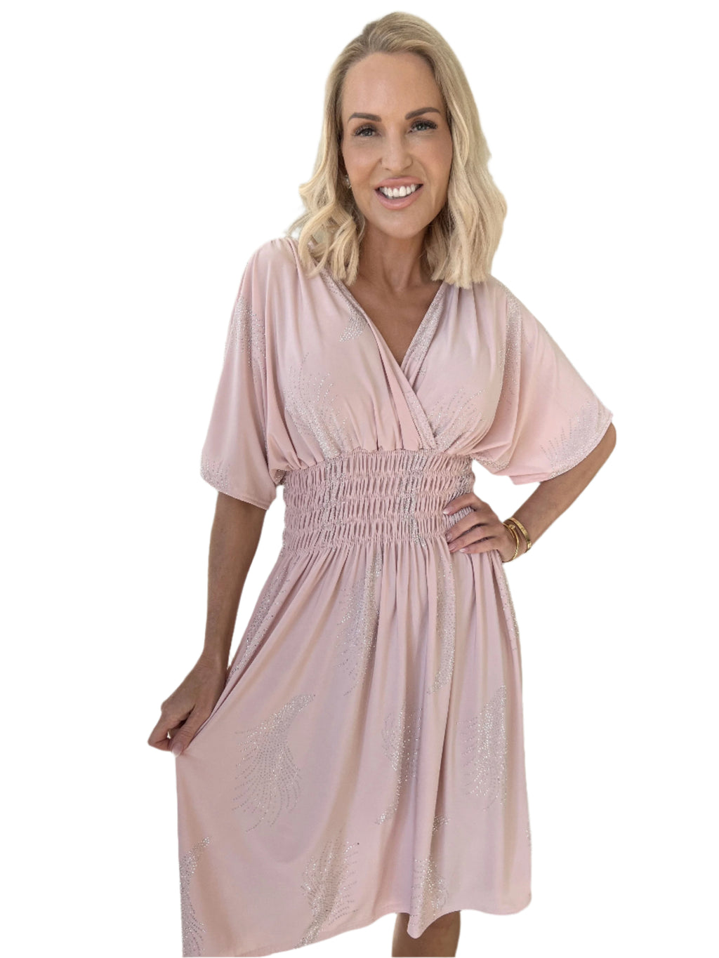 Adeline forener bohemeinspiration med moderne pasform i en smuk midikjole, der fremhæver din naturlige silhuet. Den smockede talje giver en fleksibel og flatterende pasform, mens den A-formede nederdel og V-udskæring tilfører et feminint og afslappet udtryk. Ideel til alt fra hverdagsgange til særlige øjeblikke.