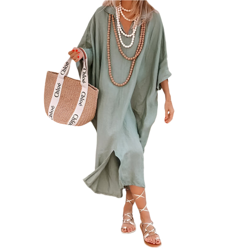 Tilføj en let og stilfuld favorit til din sommergarderobe med Caroline – en maxikjole, der kombinerer afslappet komfort med en flatterende silhuet. Den dybe V-udskæring, trekvartærmer og den subtile slids i siden skaber et ubesværet look, der passer til både strandture og hverdagsudflugter.