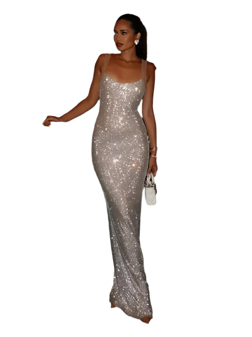 Træd ind med stil og selvtillid i Claire – en betagende sølvkjole designet til at fange lyset og blikkene. Denne gulvlange kjole kombinerer en kropsnær pasform med et glitrende finish, og de fine stropper tilføjer et strejf af ynde. Perfekt til gallafester, bryllupper eller enhver aften, hvor du vil skinne.