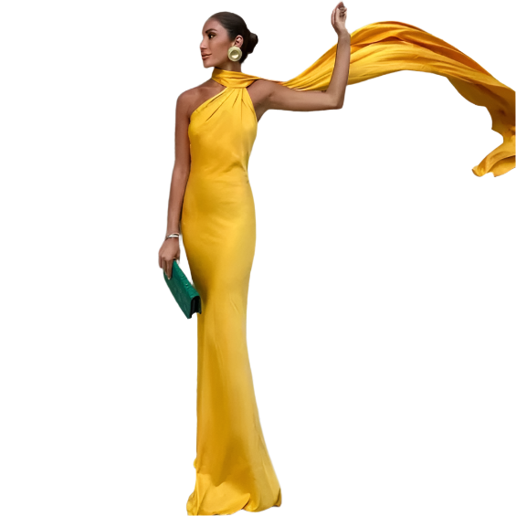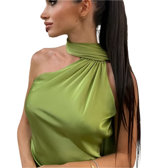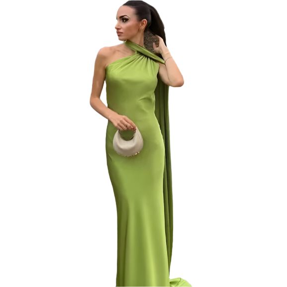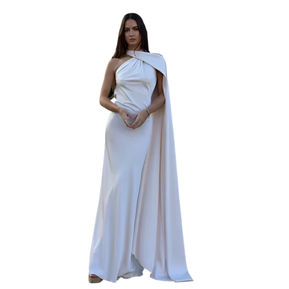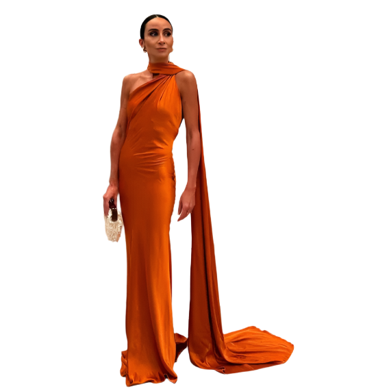 Træd ind i rummet med selvtillid i Patricia – en sofistikeret aftenkjole med en iøjnefaldende én-skulder silhuet og en elegant, draperet halsudskæring. Den tætsiddende pasform fremhæver dine kurver, mens det dramatiske slæb eller kappe tilfører bevægelse og storslået elegance.