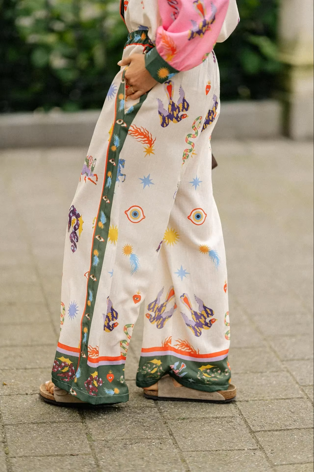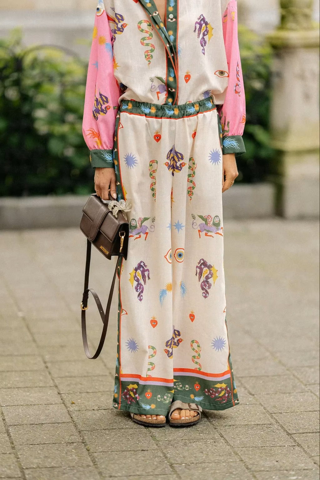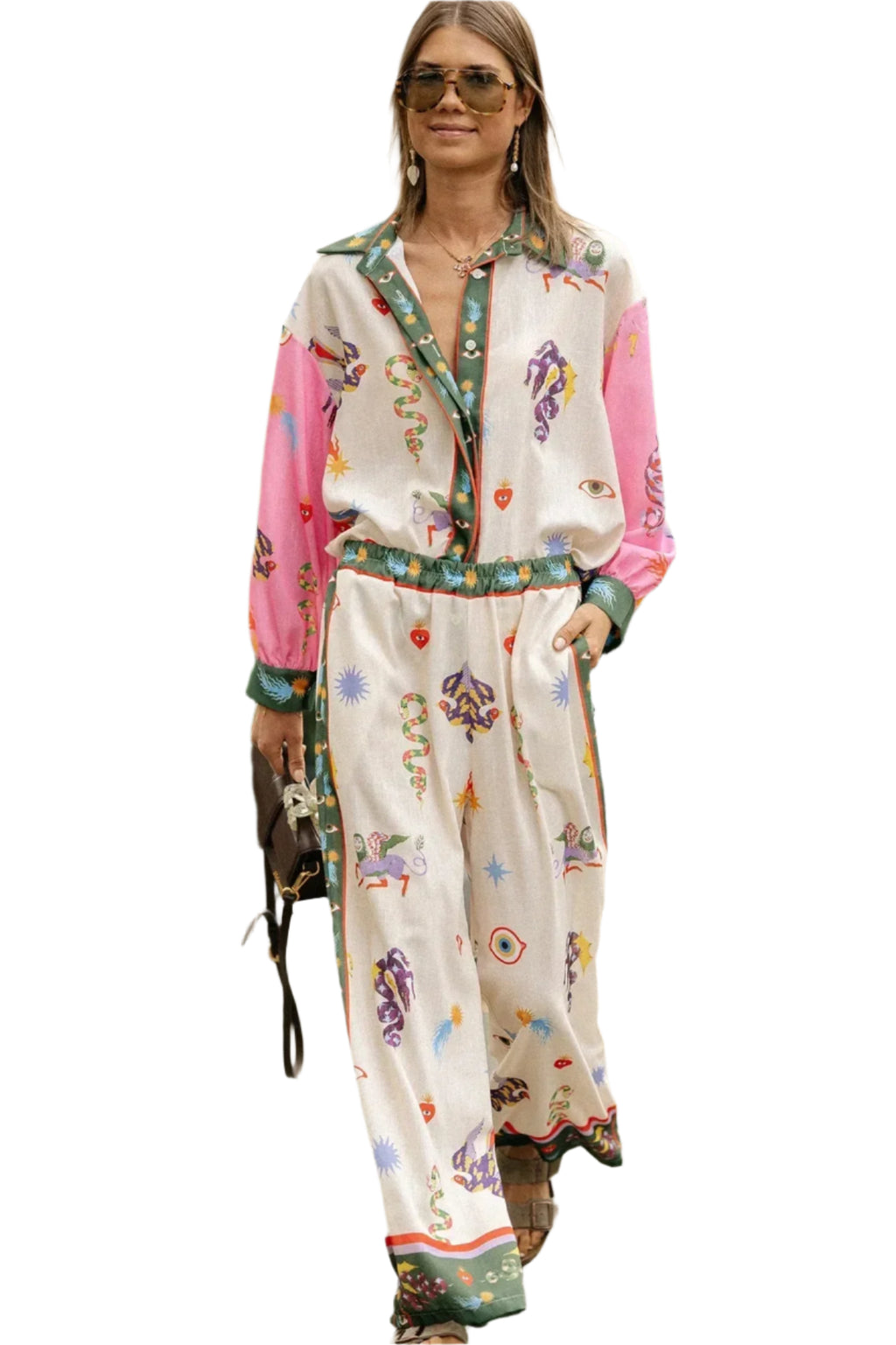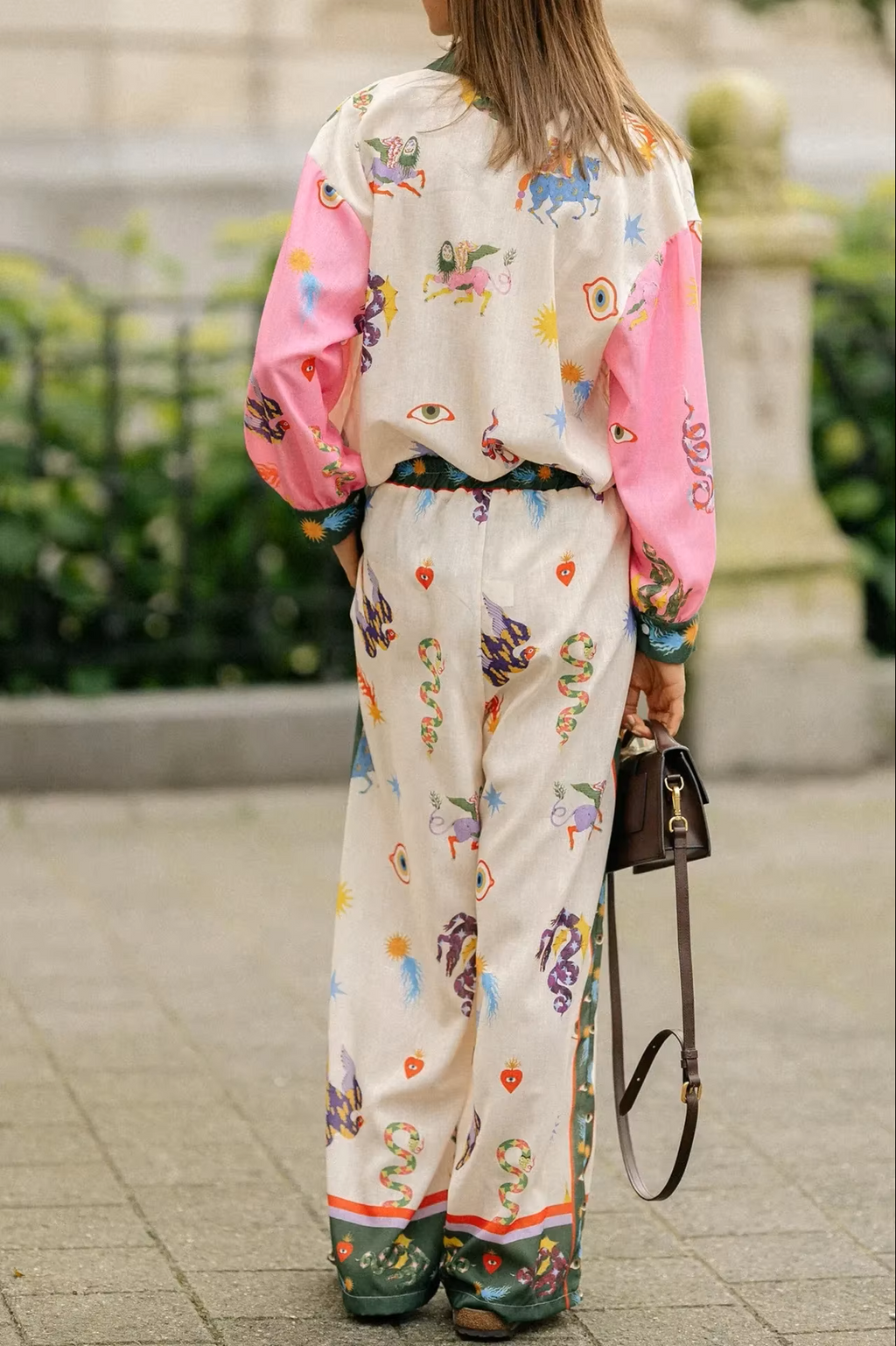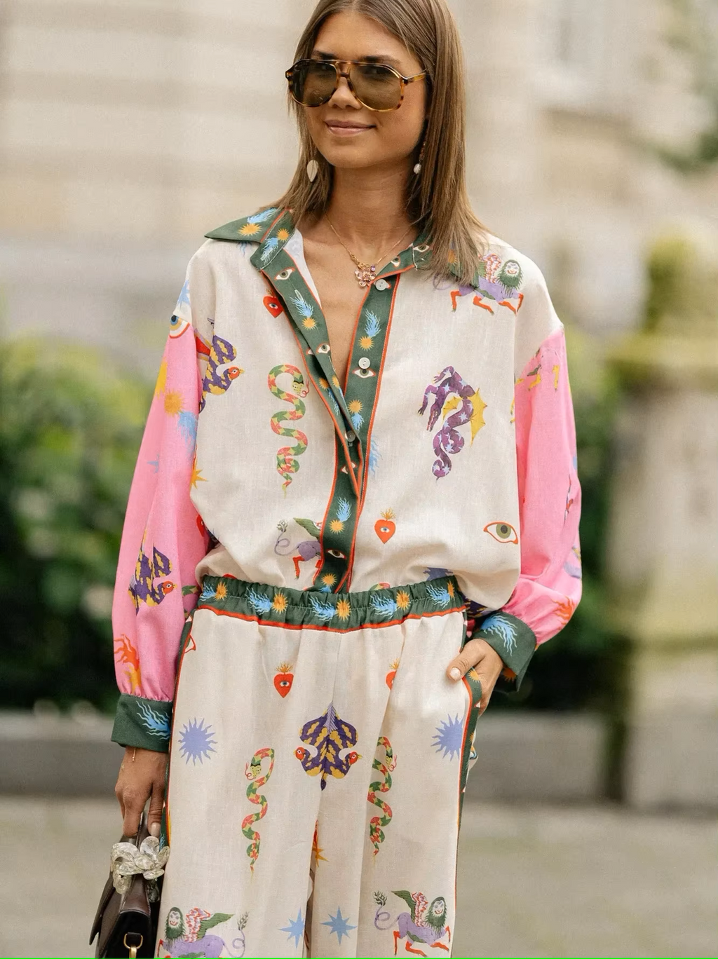 Tilføj et kreativt pift til din garderobe med Criselda – et sæt bestående af en skjortebluse med krave og matchende bukser med vidde. Det livlige print kombineret med en afslappet, men struktureret pasform gør dette sæt ideelt til dig, der ønsker at udtrykke din stil med selvtillid og lethed.