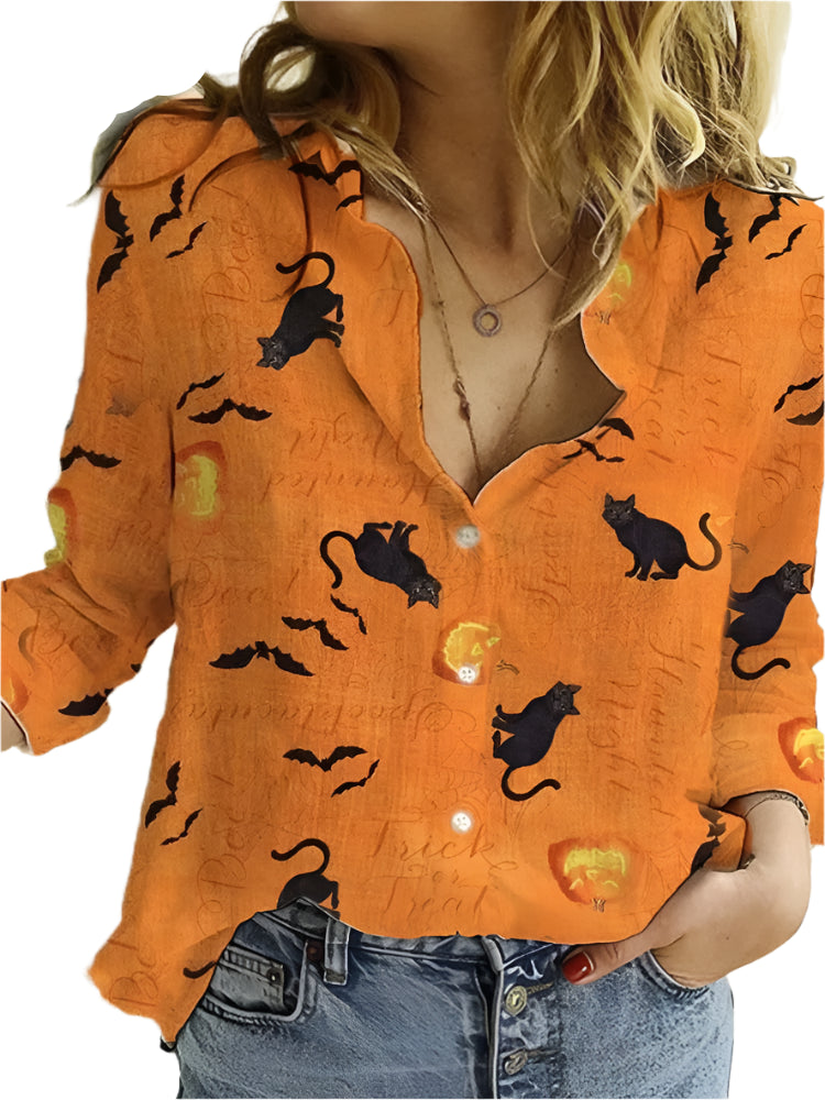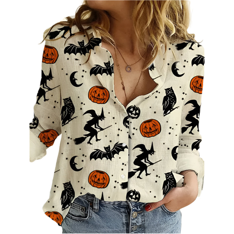 Med Dina - Uhyggelig charmebluse får dit outfit et subtilt statement, der balancerer charme med et hint af Halloween-stemning. Det lette stof og det fine print skaber et look, der både er feminint og sjovt, og som gør blusen alsidig til både sæsonens styling og til hverdag.