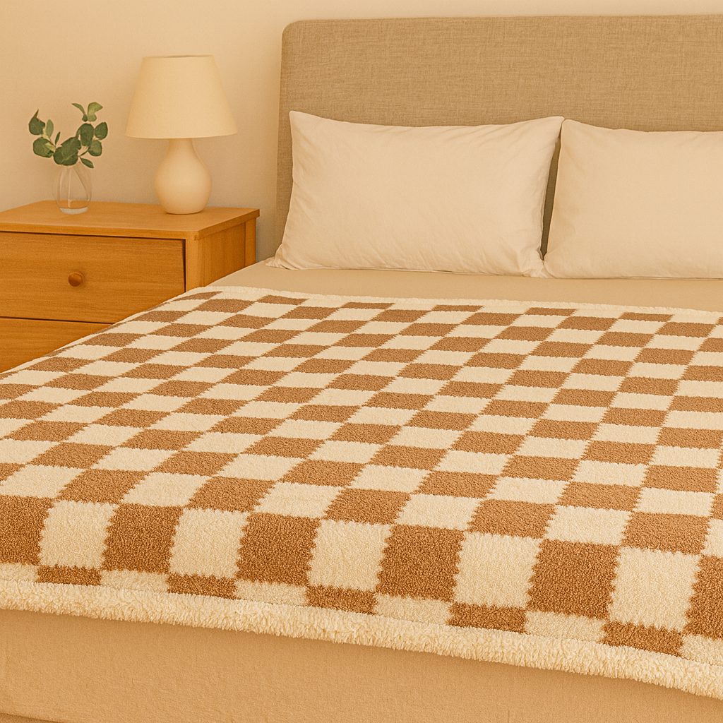 Dette tofarvede, vendbare tæppe kombinerer skiferrutet elegance med blød plys. Det dobbeltlagede design giver hygge, mens det tidløse mønster tilfører dekorativ charme til sofa, seng eller i fritiden.
