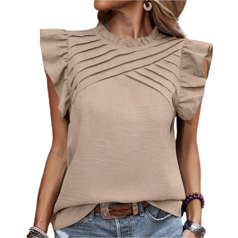 Opdater din garderobe med Ellen – en elegant top, der kombinerer romantiske flæser med fine læg for et moderne og feminint udtryk. Den luftige silhuet og det lette stof gør den ideel til varme dage, uanset om du er på vej til brunch, shopping eller en uformel sammenkomst.