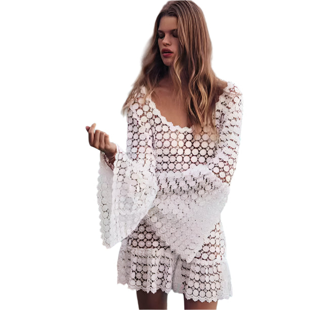 Oplev friheden ved sommerens boho-look med Elvira – en luftig og elegant hæklet kjole i hvid blonde. De lange klokkeærmer og det fine håndværk giver et romantisk og drømmende udtryk, perfekt til strandture, festivaler eller afslappede sommerfester.