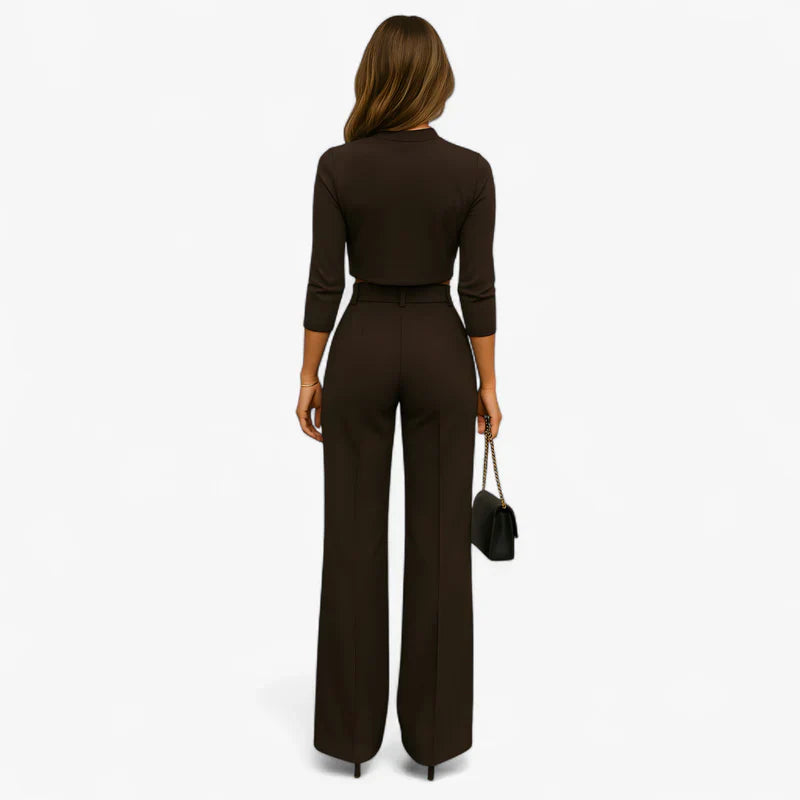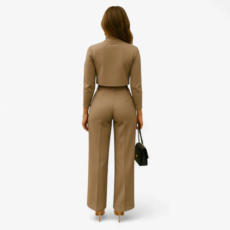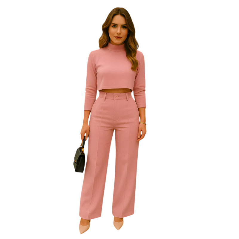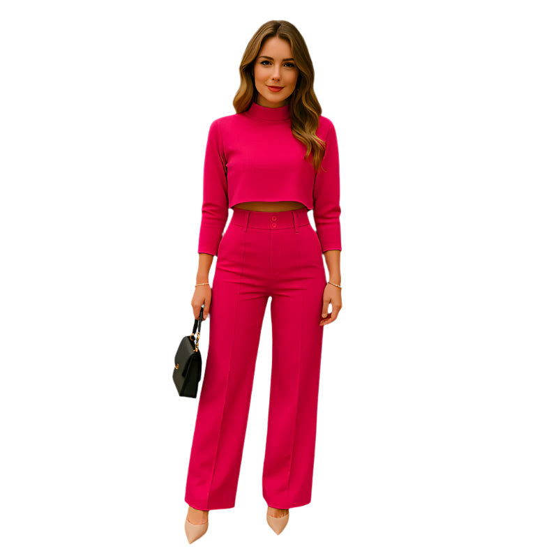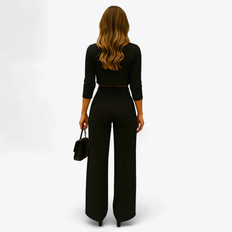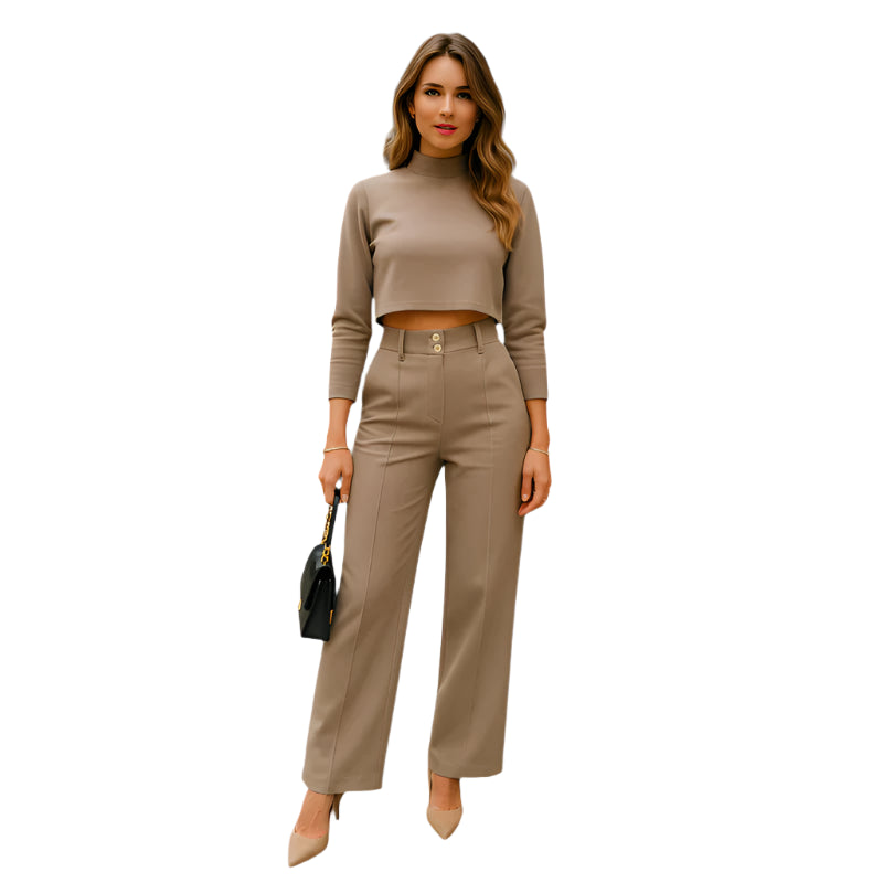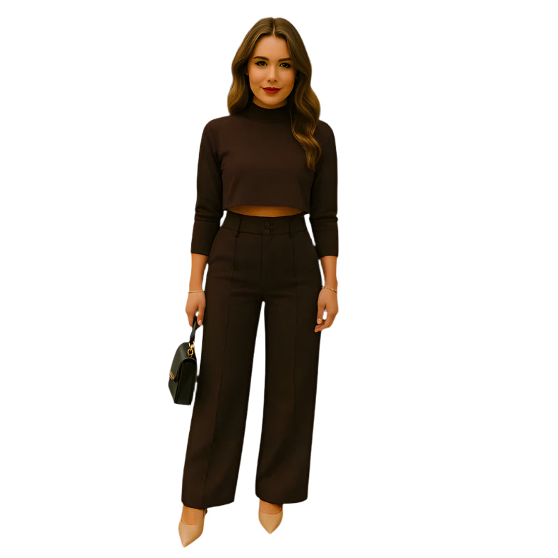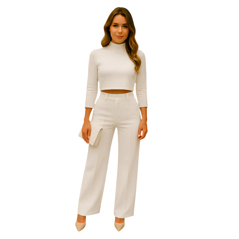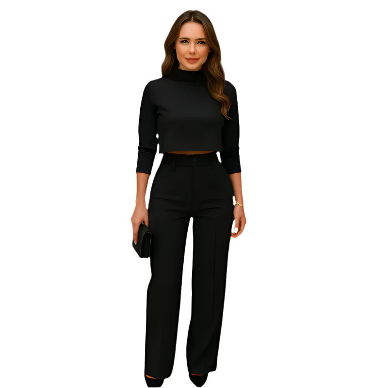 Eva-sættet er et stilfuldt udtryk for tidløs minimalisme og moderne elegance. Det består af en kort kropstop med høj hals, der kombineres med højtaljede bukser med brede ben, hvilket skaber en skarp silhuet og et sofistikeret udtryk. Perfekt til både professionelle og festlige anledninger, giver Eva et kraftfuldt og samtidig feminint look.