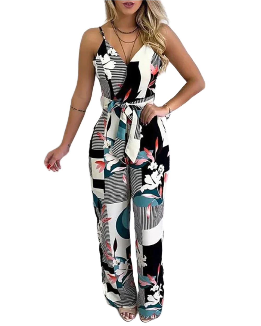 Freja jumpsuiten forener iøjnefaldende mønstre med en elegant, bæltebetonet silhuet. Med sin kombination af geometriske og blomstrede elementer skaber den et udtryk, der både er moderne og feminint. Den komfortable pasform og det smigrende design gør den perfekt til både hverdag og særlige lejligheder.