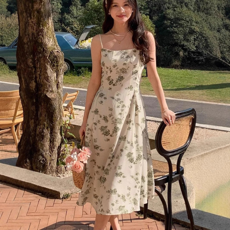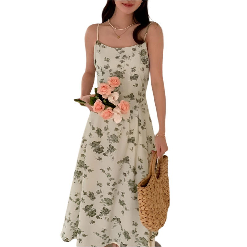 Giv din sommergarderobe et friskt pust med Jenna – en elegant midi-kjole i en blid beige tone med delikate, mørkegrønne blomster. Den luftige pasform og de tynde skulderstropper skaber et feminint og ubesværet udtryk, perfekt til varme dage, ferier eller afslappede sammenkomster.