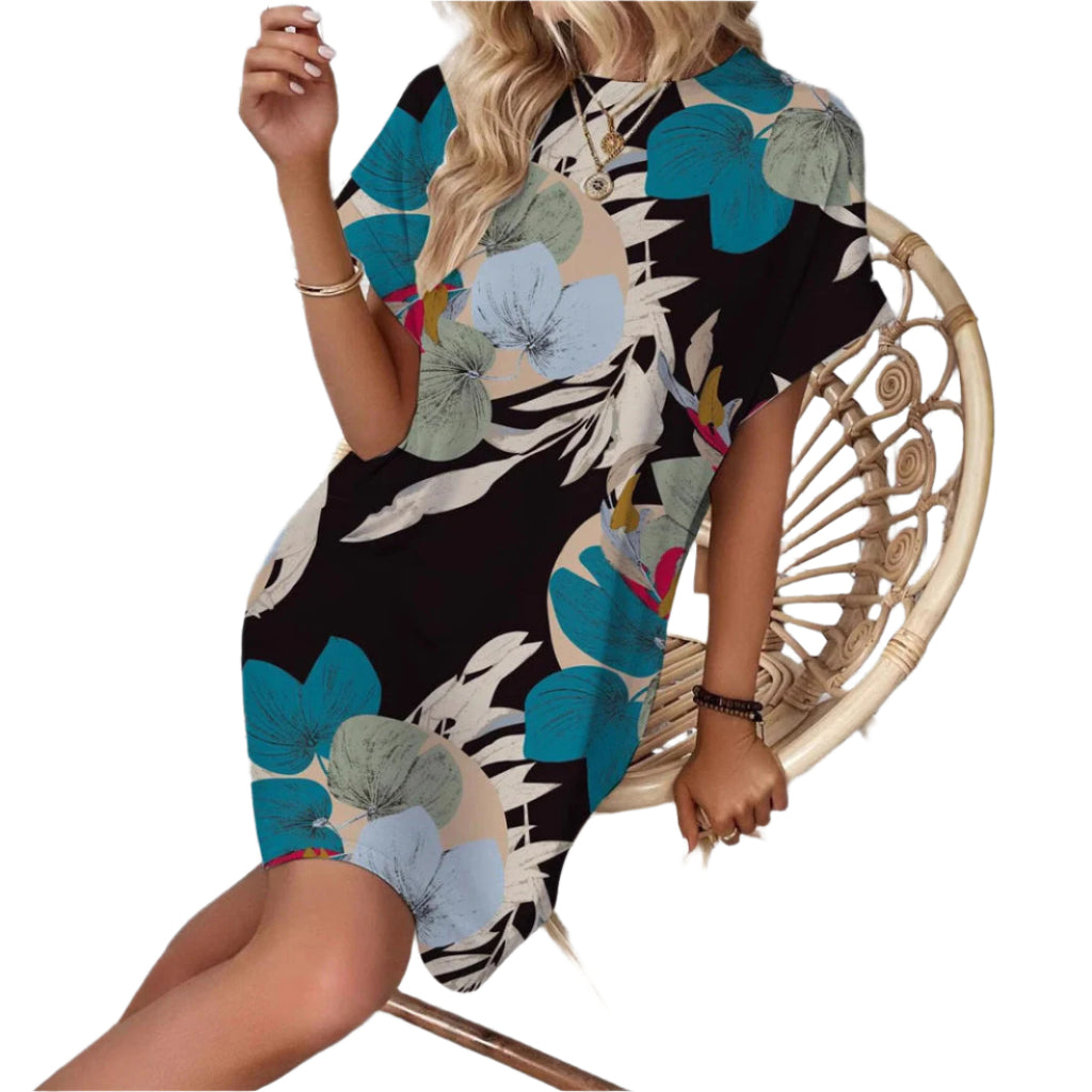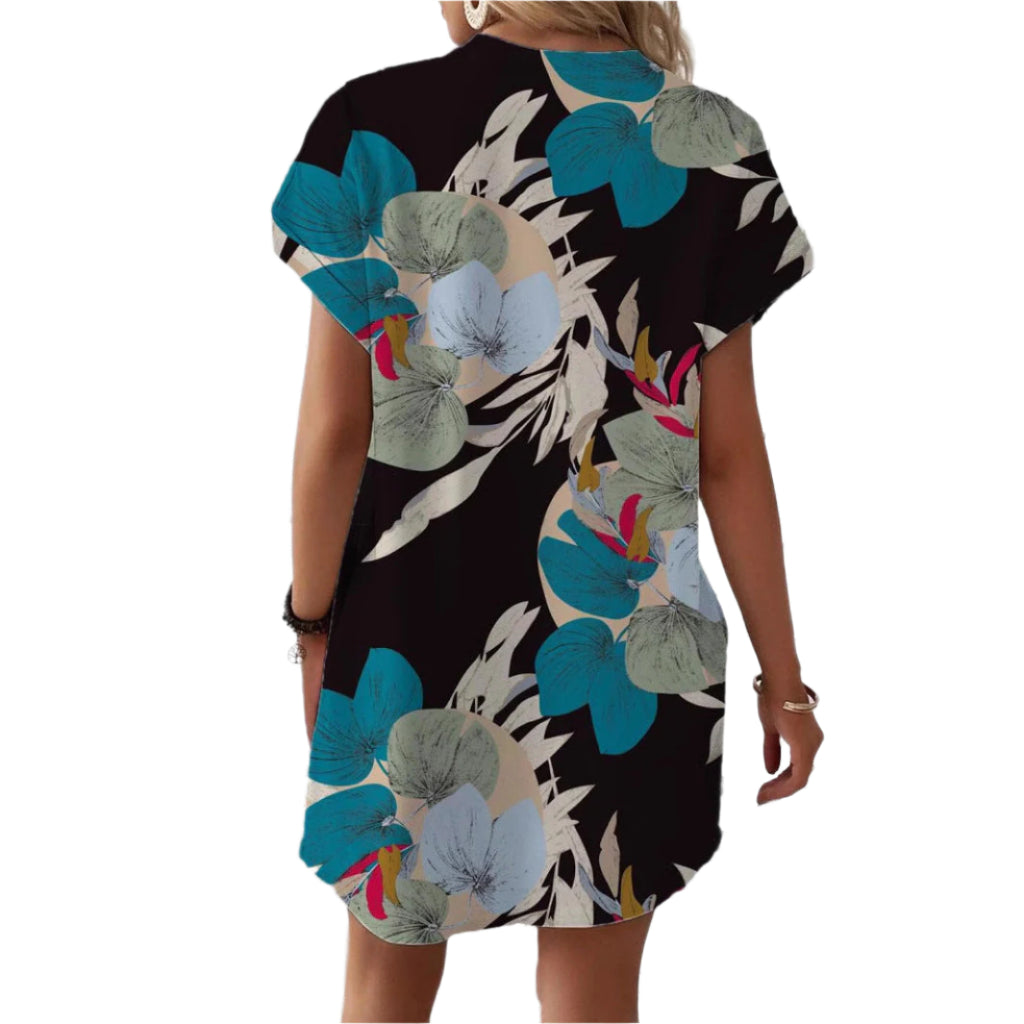 Lad Jovita tilføje et strejf af farverig elegance til din garderobe. Denne sorte mini-kjole kombinerer et iøjnefaldende blomstermønster i teal, lyseblå og beige nuancer med en flatterende pasform og korte ærmer. Perfekt til både hverdag og festlige lejligheder, skaber Jovita et stilfuldt og feminint udtryk.