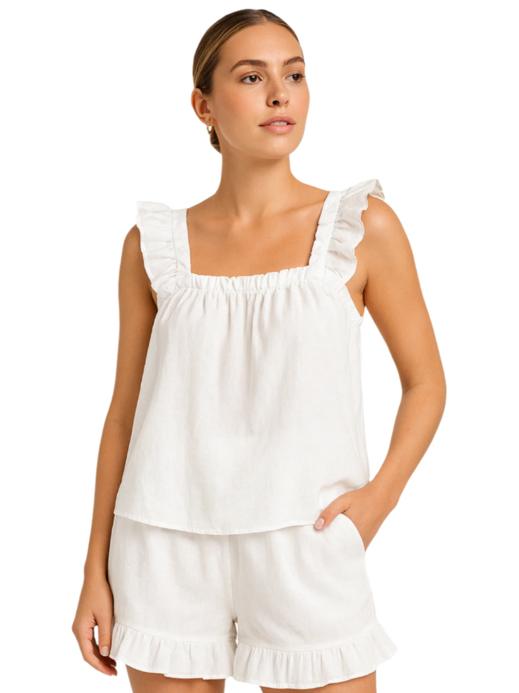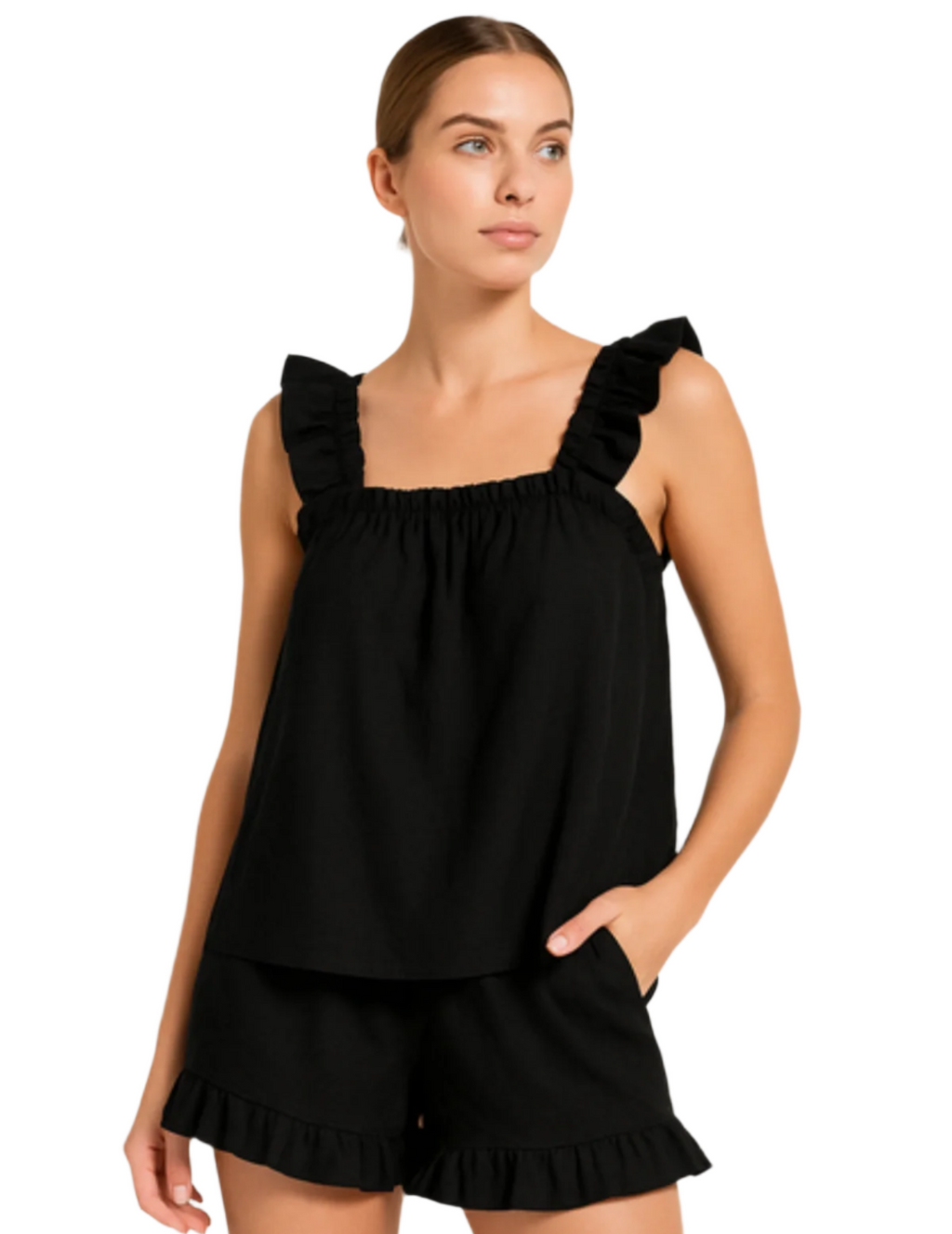 Gør dig klar til solrige dage med Kimberly – et charmerende co-ord sæt, der kombinerer afslappet komfort med feminin finesse. Toppen har en firkantet udskæring og brede skulderstropper med delikate flæsedetaljer, mens de matchende shorts fuldendes med en legende flæsekant. Perfekt til strandture, cafébesøg eller bare til afslappet sommerhygge.