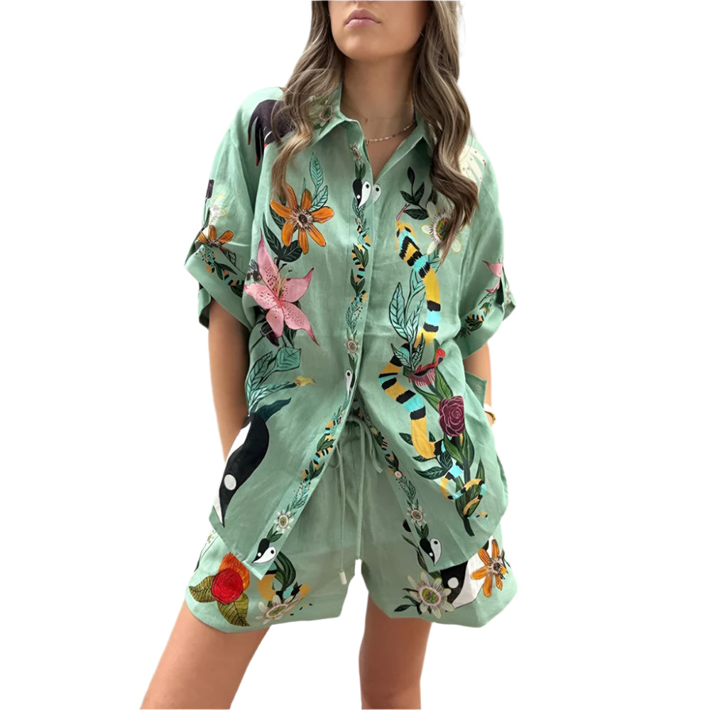 Dette lette to-delte sæt består af en luftig skjorte og matchende shorts, dekoreret med friske og livlige sommermotiver. Perfekt til varme dage, afslappede udflugter eller hyggelige stunder i solen. Materialet er blødt og åndbart, så du kan holde dig kølig og komfortabel hele dagen, mens det farverige design tilføjer et festligt touch til din garderobe.