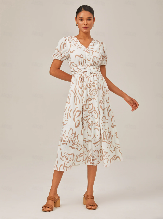 Tilføj farve og finesse til din garderobe med Liora – en elegant kjole, der kombinerer abstrakte blomsterprint med en smigrende pasform. Uanset om du skal til brunch, havefest eller en aftenudflugt, leverer Liora et moderne look med et strejf af kunstnerisk kant.