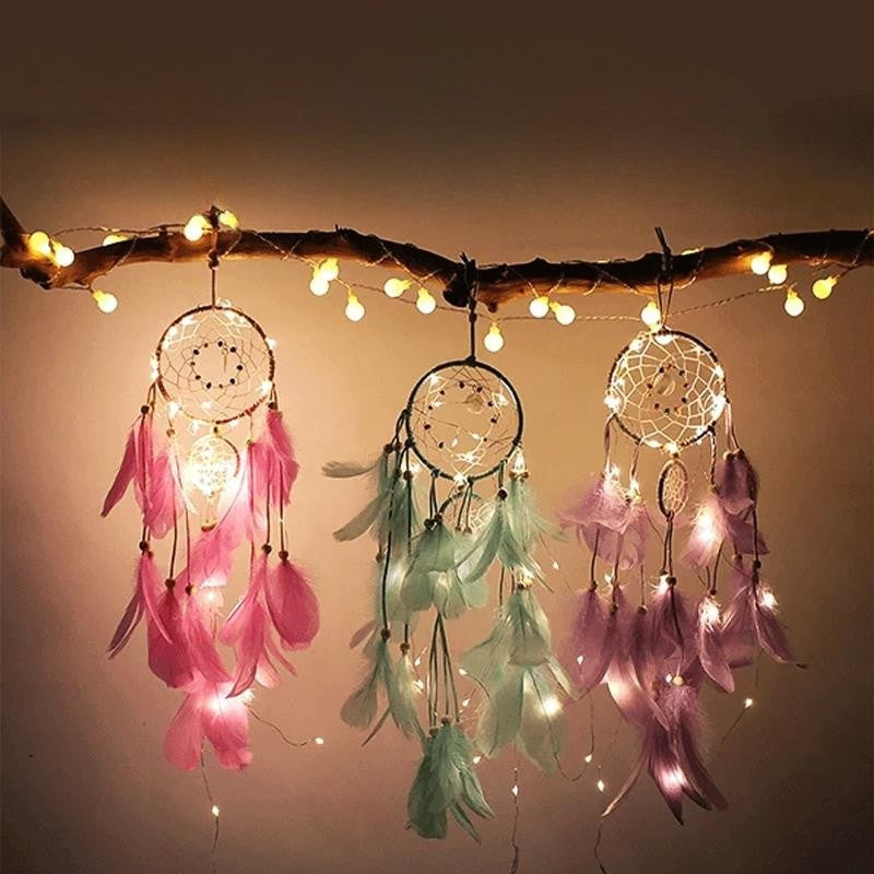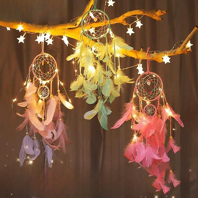 Tilføj en magisk stemning til dit hjem med LumeDrøm Dekorativ Drømmefanger. Det indviklede design, de fine fjerdetaljer og de blide LED-lys skaber en beroligende atmosfære i soveværelset, stuen eller børneværelset.