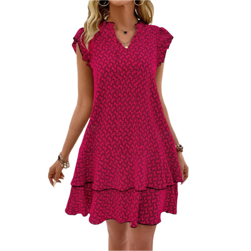 Lydia-kjolen kombinerer legende charme med ubesværet komfort. Med sine bløde flæseærmer, en flatterende V-udskæring og et lagdelt miniskørt er denne kjole skabt til bevægelse og stil. Den diskrete geometriske struktur i stoffet tilføjer et moderne twist til et ellers klassisk snit – perfekt til både afslappede dage og spontane udflugter.