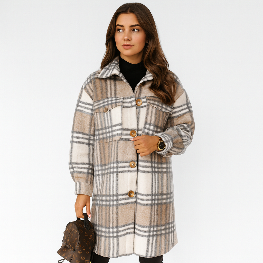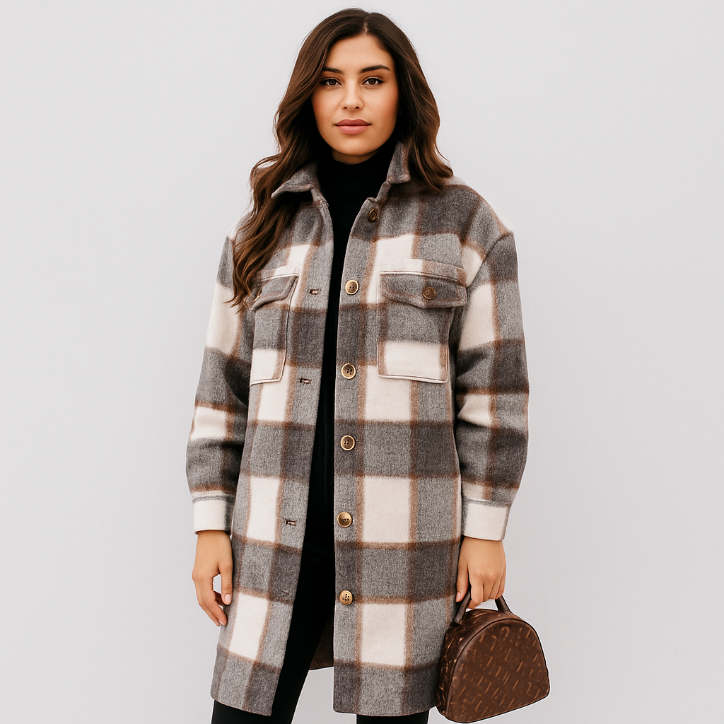 Megan er en langærmet, ternet uldjakke med knapper og lommer. Den lidt længere, lige pasform er flatterende og giver god bevægelsesfrihed. Behageligt varmende og alsidig til hverdag, arbejde og fritid.