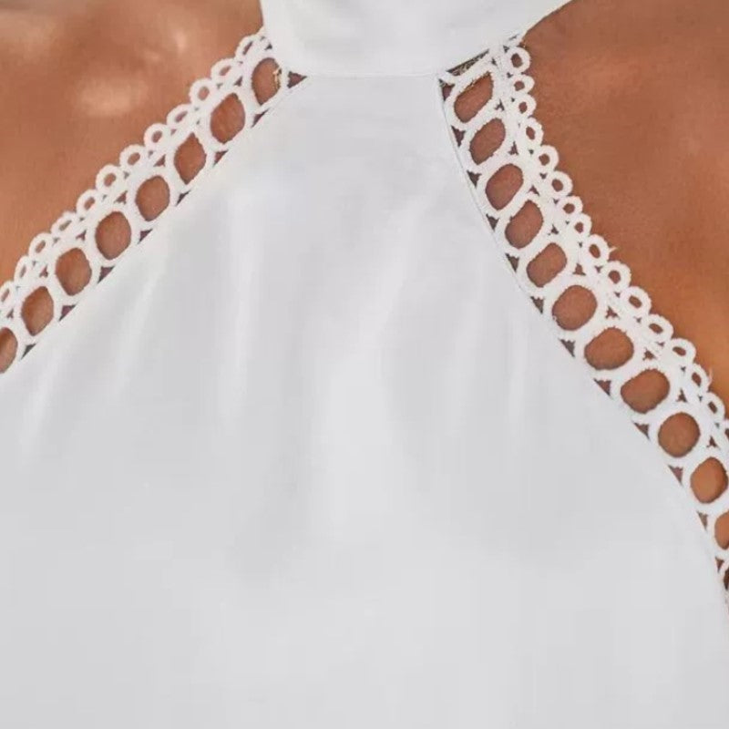 Halterneck-design: Indrammer skuldrene og giver en moderne, stilren linje.