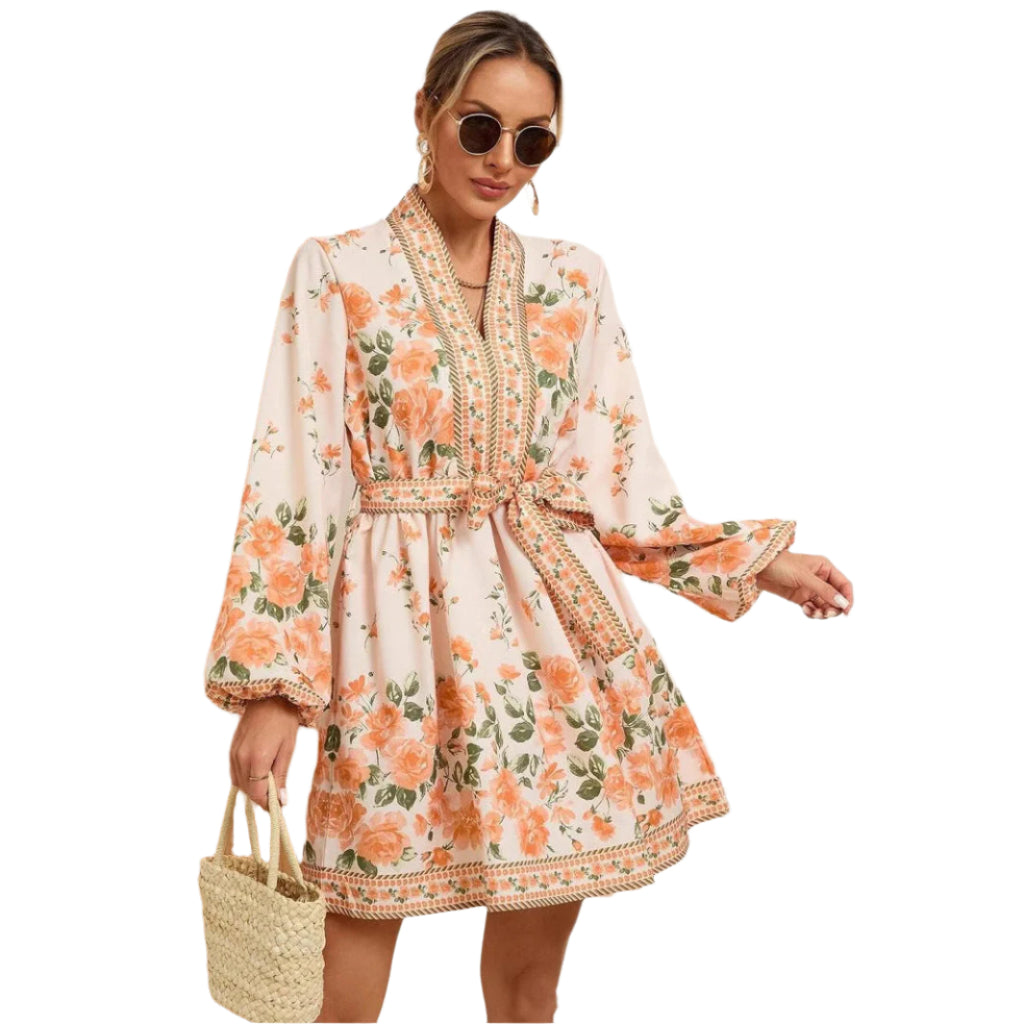 Giv din stil et frisk pust med Selma – en legende, men elegant minikjole med lange ærmer og flatterende V-udskæring. Denne kjole kombinerer et livligt print med et tidløst snit, hvilket gør den ideel til både hverdagsbrug og særlige anledninger.