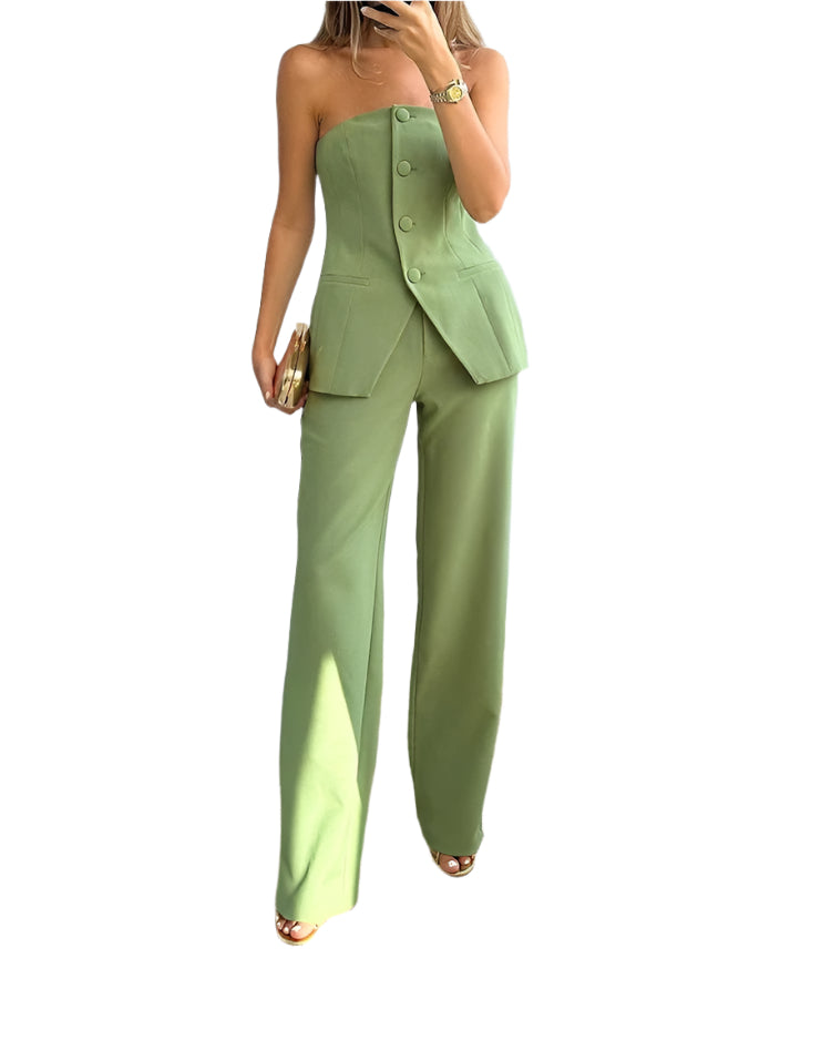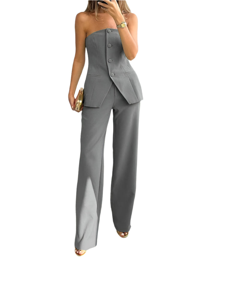 Opdag stilfuld selvsikkerhed med Soffie – en elegant buksedragt, der kombinerer moderne design med tidløs appeal. Det stropfri snit fremhæver skuldrene, mens de brede ben skaber et yndefuldt, strømlinet udtryk. Perfekt til alt fra fester og middage til formelle begivenheder.