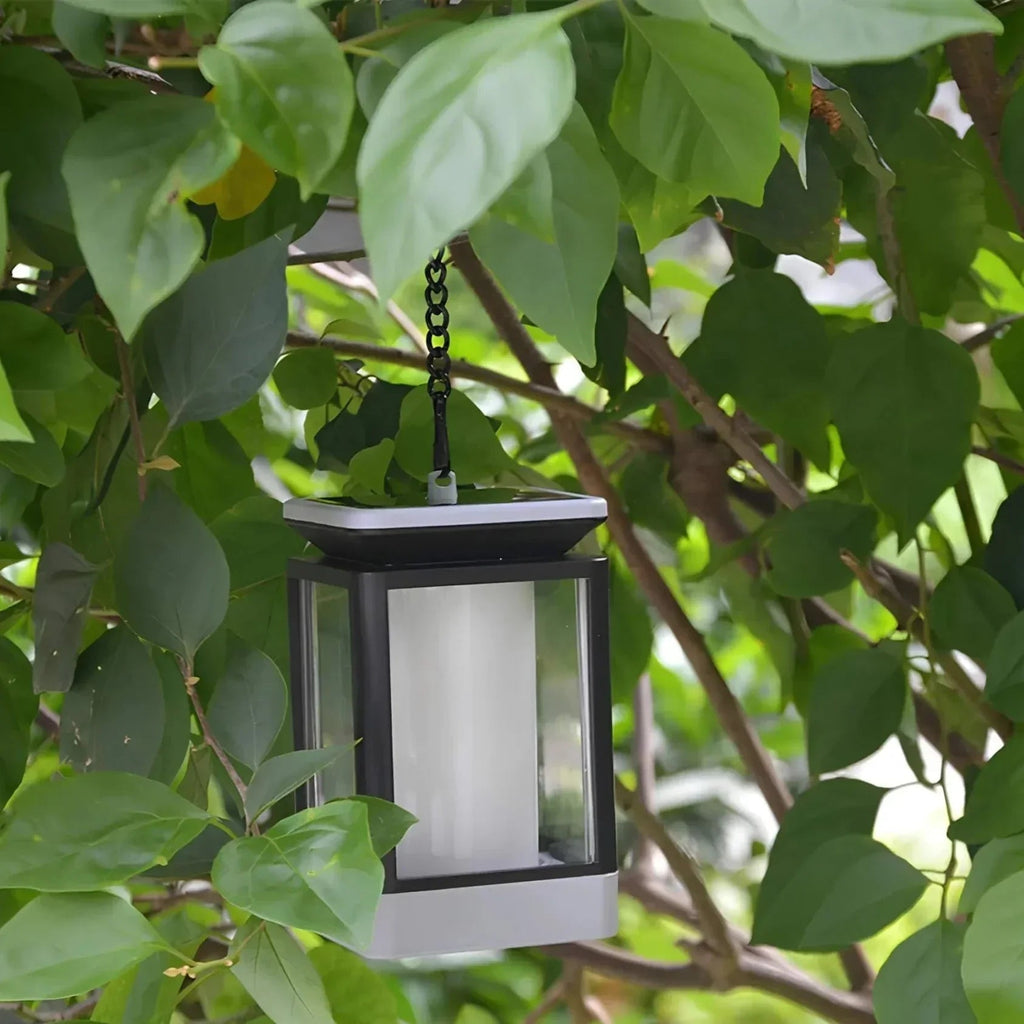 Forbedre din udendørs stemning med SolarGlow Hanging Lantern, der har et tidløst firkantet design. Dens mørke metalramme og bløde hvide diffuser giver en varm, indbydende glød, perfekt til haver, terrasser og gangbroer.
