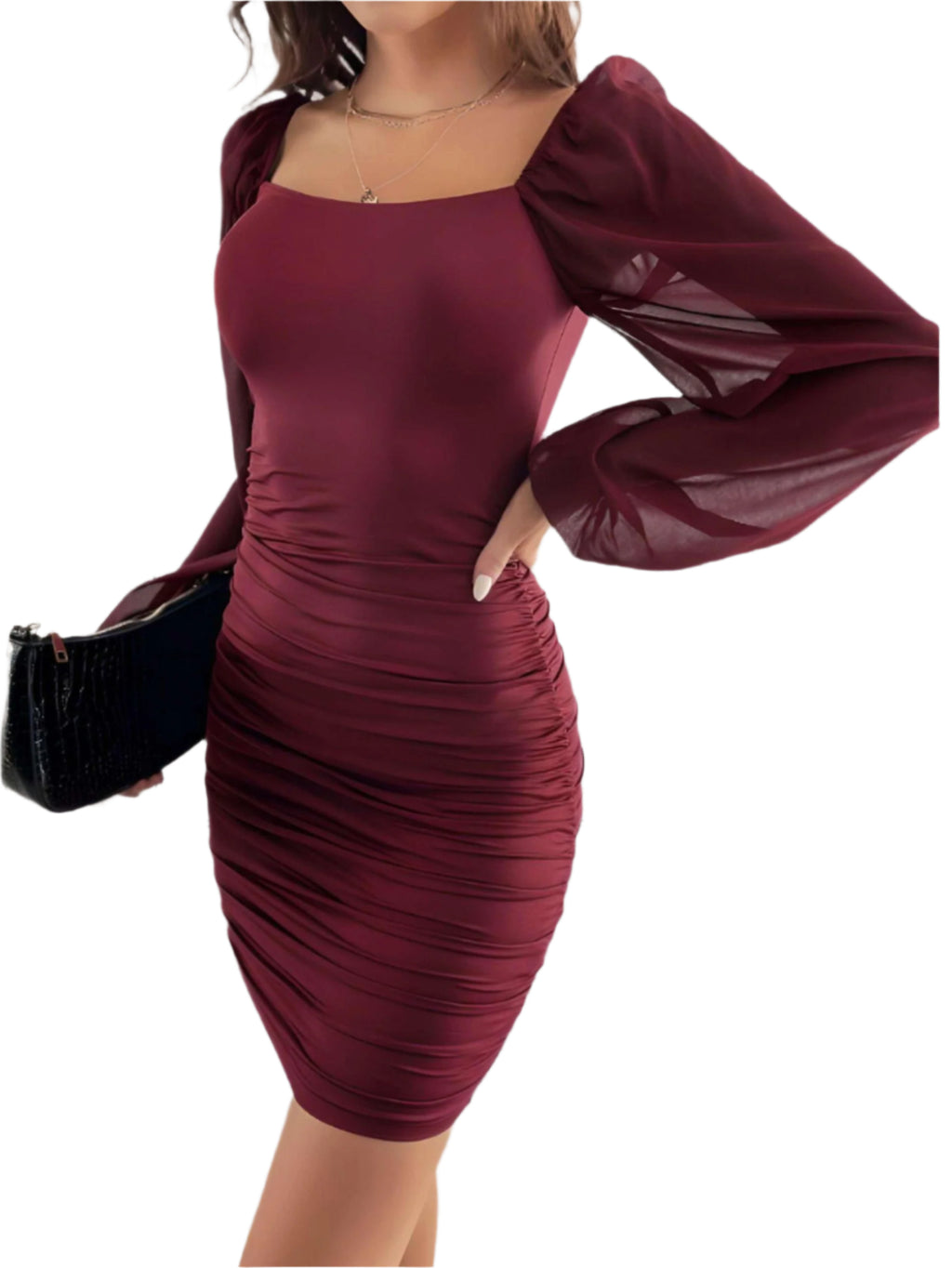 Sylvia minikjolen kombinerer moderne detaljer med sofistikeret charme. Med sin firkantede udskæring, lange gennemsigtige ærmer og flatterende rynket skørt er den skabt til at tiltrække opmærksomhed – perfekt til festlige begivenheder eller en aften i byen.